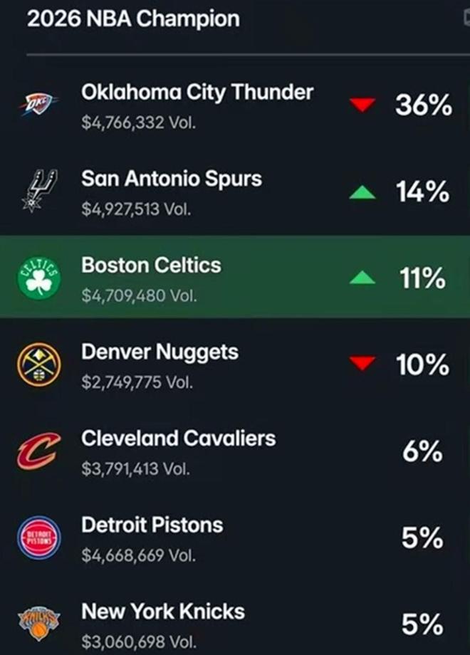 NBA最新夺冠概率更新!火勇湖三大热门皆落选,马刺成超级黑马近16战15胜高居第二,榜首36%断层领跑。