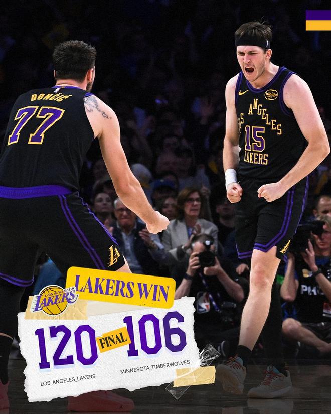 NBA常规赛继续进行,洛杉矶湖人队(40胜25负)继续连胜。东契奇送出三双31分、11个篮板和11次助攻,里夫斯得到31分、7个篮板和8次助攻,他们率队第三节打出小高潮一举确立优势,湖人队在主场以120-106战胜明尼苏达森林狼队(40胜25负)。湖人队拿到3连胜,本赛季横扫对手,森林狼队遭遇2连败。